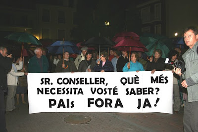Por eso hoy, a las 20 horas, nos hemos vuelto a concentrar frente al Ayuntamiento, sin lluvia pero con paraguas, nuestro símbolo, para pedir como siempre, de manera democrática pero contundente, que se nos respete. Todo está en contra de estos PAI y se ha demostrado que el interés general va por otros derroteros. La pancarta lo decía bien claro “SR. CONSELLER, QUÈ MÉS NECESSITA VOSTÉ SABER? PAIs FORA JA!” El manifiesto leído al final de la concentración (adjunto) también iba en el mismo sentido. No entendemos por qué se nos sigue oprimiendo con el peso de esta losa de cemento. Son 2 años ya de manener esta pesada losa sobre nuestras espaldas y no queremos que finalmente nos aplaste y se impongan el cemento y el dinero sobre las personas. Esta losa es insostenible y debe desaparecer ya. Y eso es lo que ha pedido la gente, que de manera simbólica ha introducido en un sobre dirigido al Sr. Conseller García Antón sus quejas y deseos nacidos desde el alma.